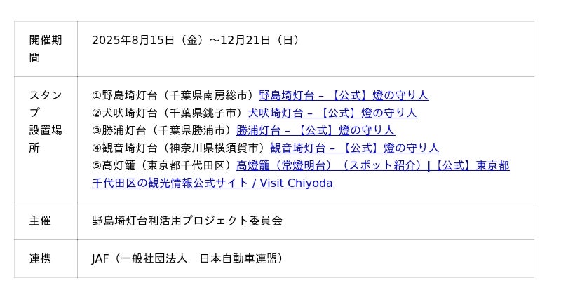 この度、燈の守り人のキャラクター活用権を有する千葉県南房総市と連携し、関東の5つの灯台をめぐるデジタルスタンプラリーを開催。スタンプを全て集めた方には、先着300名に『燈の守り人』のキャラクター(野島埼灯台)がデザインされたクリアファイルをプレゼントするほか、豪華景品をご用意しております。歴史と光をめぐる旅を、ぜひお楽しみください。
