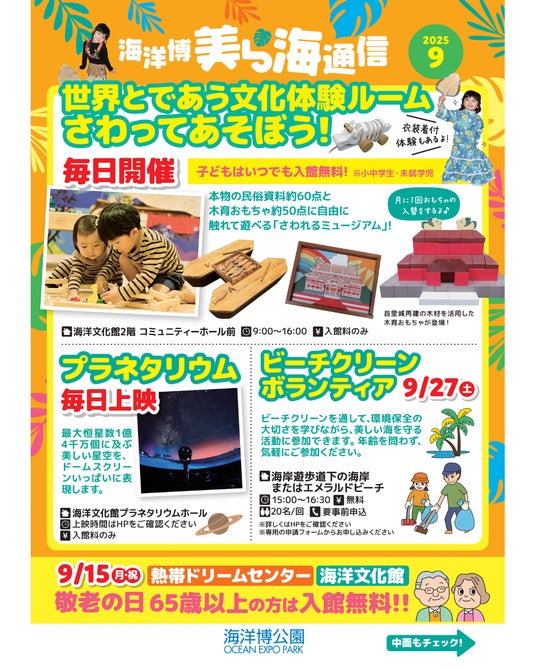 海洋博公園では、園内の最新情報やイベント情報をお届けする広報誌『美ら海通信』2025年9月号を発行いたしました。本号では、海洋博公園で楽しめる様々なプログラムを紹介しております。