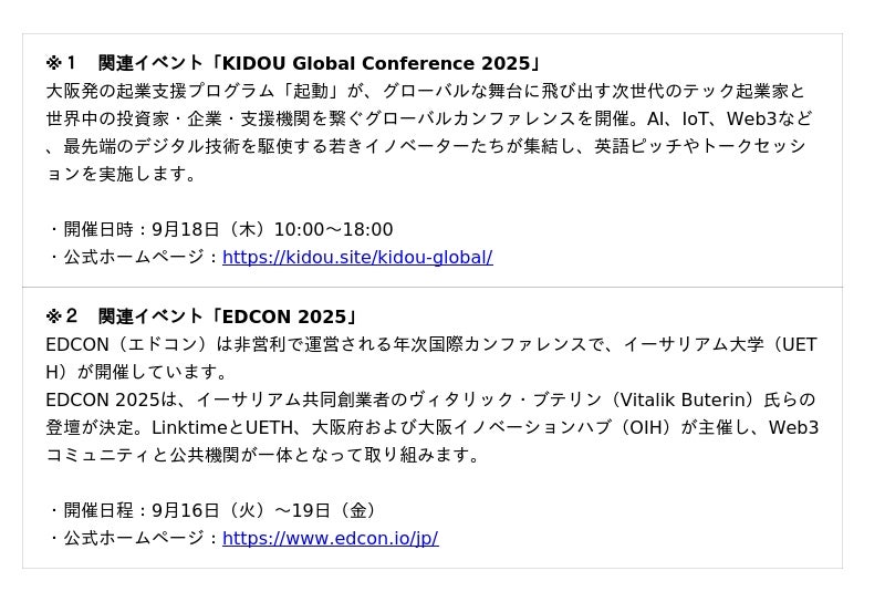 さらに、「KIDOU Global Conference 2025」※1や「EDCON 2025」※2など、グローバルなイノベーションイベントとも連携を予定しており、大阪を舞台に、次世代の技術と挑戦が世界へ広がる絶好の機会となります。