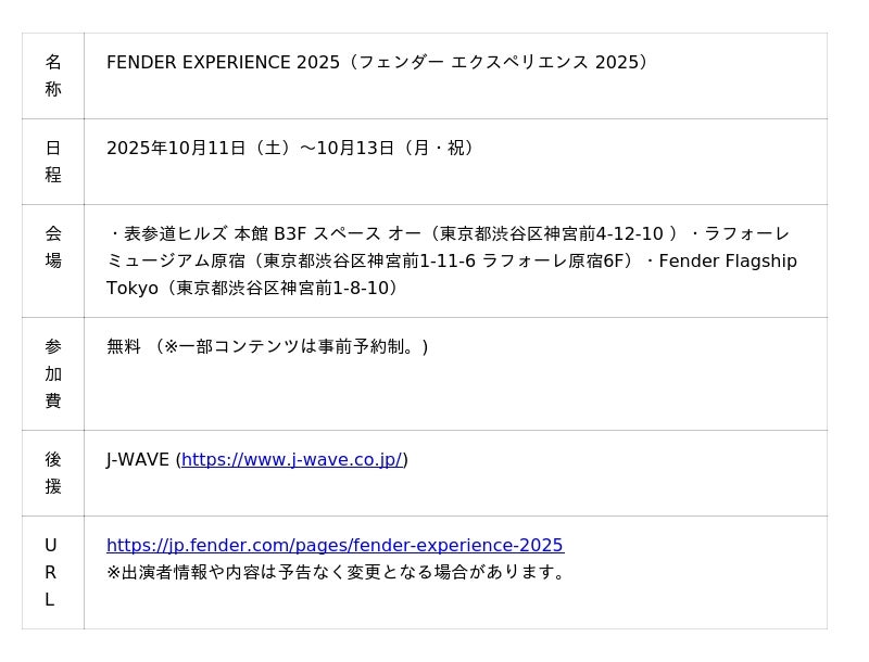 2025年10月11日(土)~13日(月・祝)、原宿・表参道エリアで開催されるフェンダーの体験型イベント【FENDER(R) EXPERIENCE 2025】の追加情報が発表されました。今回の発表では、最終となる出演アーティスト情報、ステージタイムテーブルおよびFender Custom Shopマスタービルダーによる特別なカスタムオーダーセッションの詳細&申込方法が公開されました。