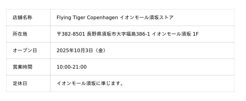 この度、フライングタイガーは、 2025年10月3日(金)に、長野県須坂市の新しい商業施設「イオンモール須坂」の1階に、長野県初のストアをオープンします。今回の出店を通して、近隣のお客様にフライングタイガーらしい楽しいショッピング・エクスペリエンスをご提供していきます。