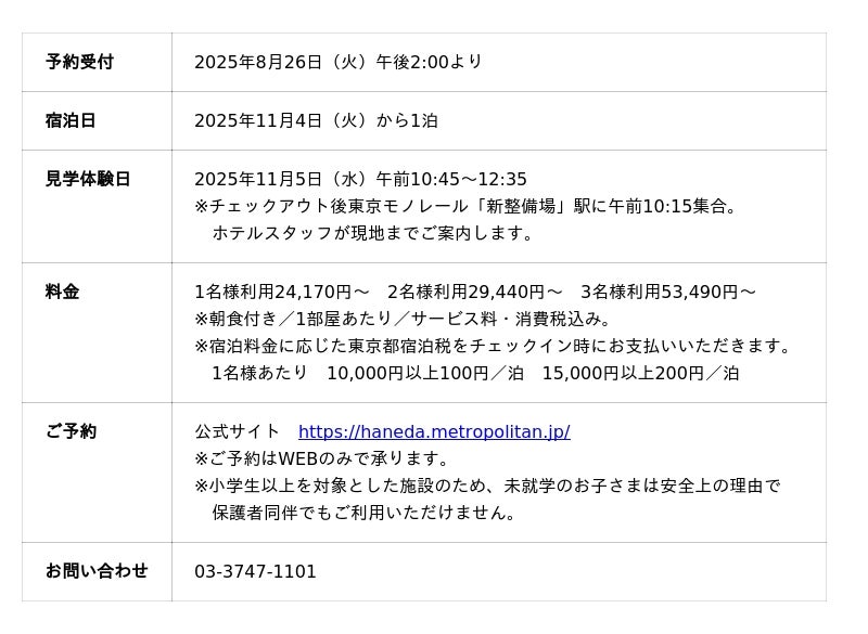羽田空港第3ターミナルから1駅の天空橋駅に位置するホテルメトロポリタン 羽田(運営/日本ホテル株式会社 総支配人/塩原 健)は、2025年10月17日に開業2周年を迎えるにあたり、これを記念して、日本航空株式会社(以下:JAL)が運営する 「JAL SKY MUSEUM」 の見学体験が付いた宿泊プランを販売します。