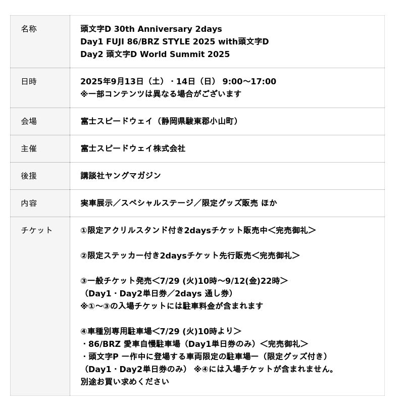 富士スピードウェイ株式会社(本社:静岡県駿東郡小山町)は、講談社ヤングマガジンの後援のもと、伝説的大ヒット漫画『頭文字D』(著:しげの秀一)の連載開始30周年を記念したスペシャルイベント「頭文字D 30th Anniversary 2days」を、2025年9月13日(土)・14日(日)の2日間にわたり開催いたします。