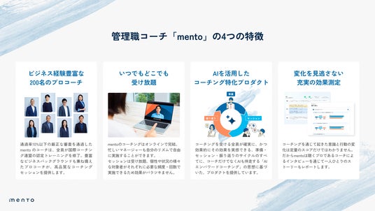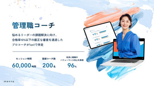 「mento(メント)」は、リーダーの本音を引き出して組織を変える、管理職向けのコーチングサービスです。企業の皆様に高品質なコーチングをより手軽に使っていただけるプラットフォームをオンラインで展開しています。これまでに累計70,000時間以上のコーチングを提供しており、登録コーチは約200名にのぼります。2020年のリリース以降、パナソニック、伊藤忠、電通をはじめとする大手企業を中心に導入が広まっています。