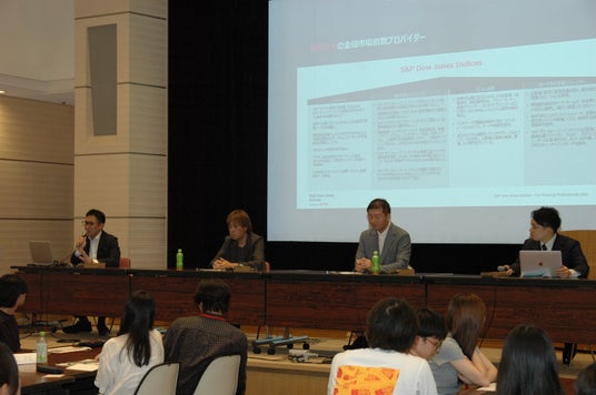 登壇者には、東京証券取引所の岡崎啓氏、ウィブル証券の三塚英毅氏、S&Pダウ・ジョーン