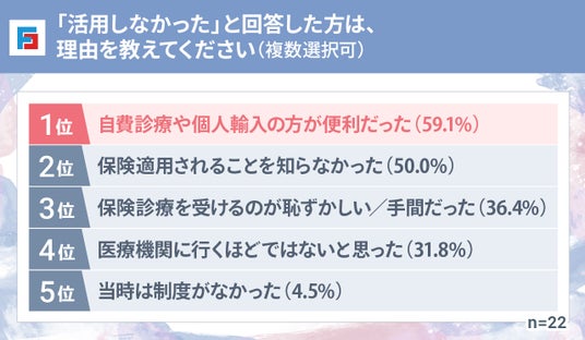 保険を活用しなかった理由としては「自費診療や個人輸入の方が便利だった」が最多となりました。そのほか「保険適用されることを知らなかった」「保険診療を受けるのが恥ずかしい/手間だった」が挙がり、制度の認知不足や心理的ハードルが浮き彫りになりました。
