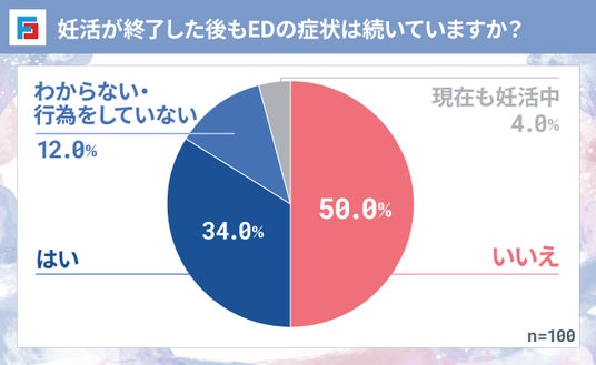 妊活終了後もEDの症状が続いているかの問いに対し「はい」と回答した人は3割以上にのぼり、一時的な症状にとどまらない可能性も示唆されました。