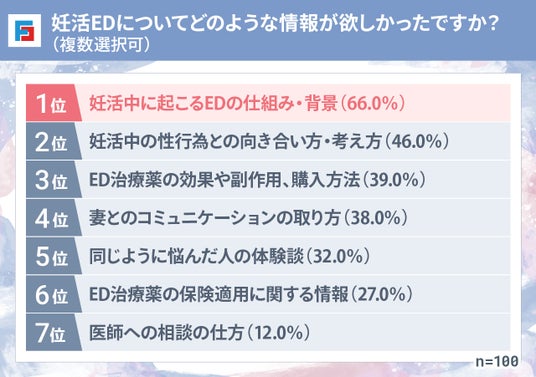 妊活中に欲しかった情報としては、「妊活中に起こるEDの仕組み・背景」が最多でした。