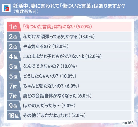 妻に言われて傷ついた言葉は「特にない」が最多となりましたが、これは必ずしもストレスがなかったということではなく、夫自身の中でプレッシャーを抱えていたり、周りの人の言葉以外の雰囲気や態度が影響していた可能性も考えられます。