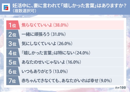 妊活中に妻からかけられて嬉しかった言葉として、最も多かったのは「焦らなくていいよ」でした。