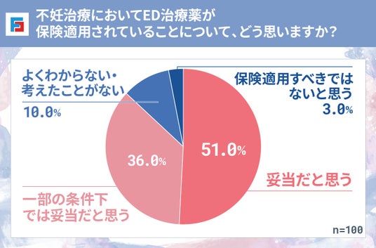 一方で、ED治療薬の保険適用については「妥当だと思う」「一部条件下では妥当だと思う」が合わせて全体の9割近くとなり、多くの人が肯定的に受け止めています。