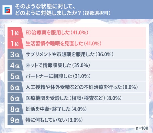 ED症状への対処としては、「ED治療薬を服用した」と「生活習慣や睡眠を見直した」が同率で最多となりました。