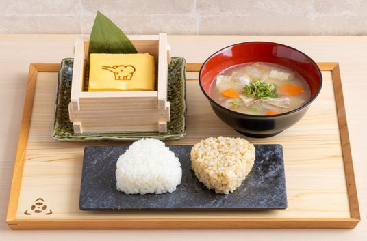 お好みのおにぎり(数量・種類を選択)に、「だし香る玉子のせいろ蒸し」と「旨みあふれる具沢山豚汁」を添えた和定食です。追加トッピングに「3種類のおかず味噌」や「大森屋 のり結び 焼き海苔」もご用意しており、味の違いをお楽しみいただけます。