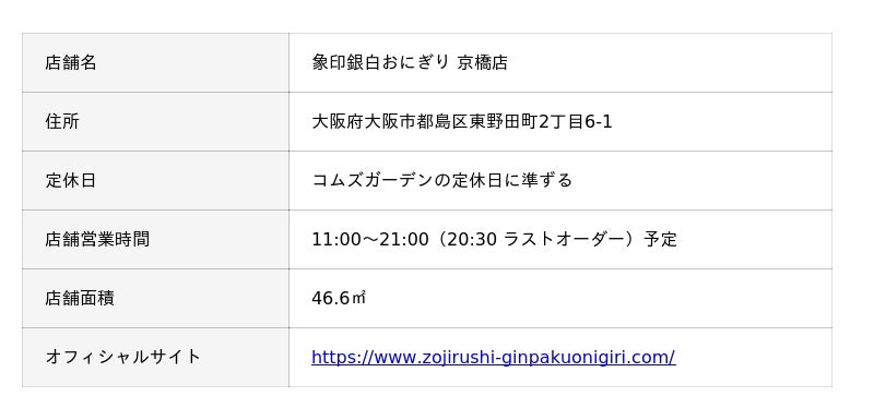 象印マホービン株式会社は、商業施設「コムズガーデン」(Osaka Metro京橋駅直結)に「象印銀白おにぎり 京橋店」を、2025年9月1日(月)に出店いたします。本店舗は、阪神梅田本店の「象印銀白おにぎり」に続く2店舗目で、当社のおにぎり専門店としては初となるイートインスペースを併設し、店内飲食限定のメニューをご用意いたします。