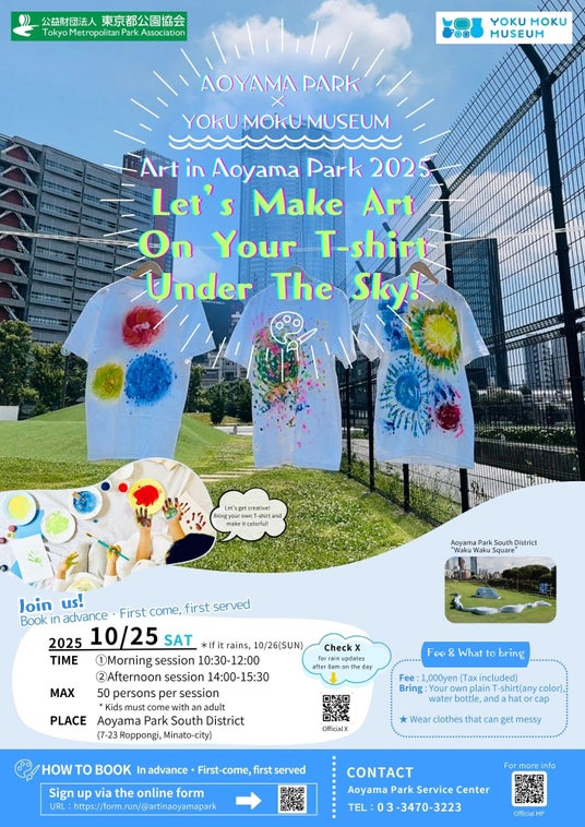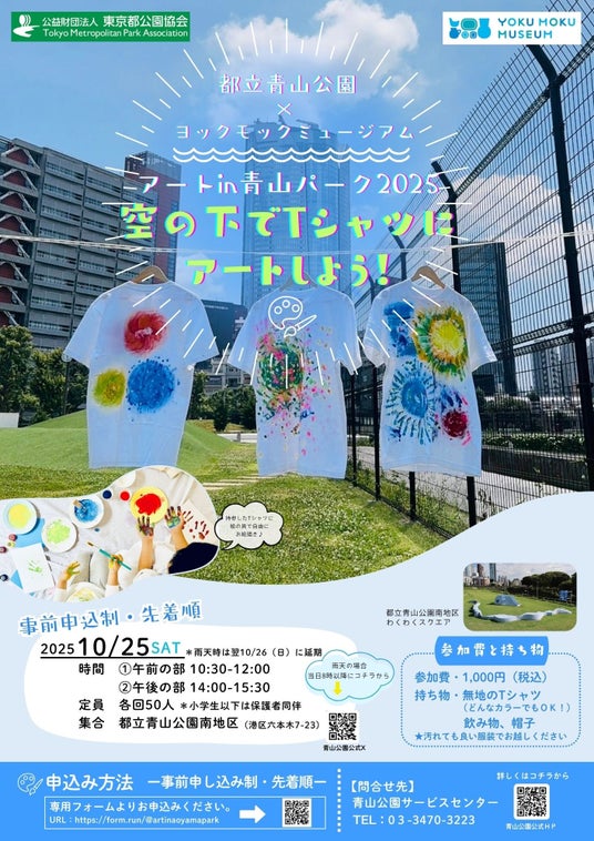 ヨックモックミュージアム(住所:東京都港区南青山6-15-1)は、都立青山公園で行うアートセッションイベント「アートin青山パーク2025 ~空の下でTシャツにアートしよう!~」を2025年10月25日(土)に(公財)東京都公園協会と共同で開催します。公園の広い空の下で、のびのびと自由に絵を描き、世界にひとつだけのオリジナルTシャツをつくってみませんか?※「青山パーク」とは「都立青山公園」のことです。