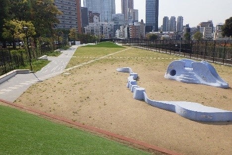 都立青山公園は、青山霊園に隣接した都立公園で、北地区と南地区の2つのエリアに分かれています。今回のイベント会場となる南地区「わくわくスクエア」は、2023年11月に新規開園したエリアです。新国立美術館や六本木ヒルズが望む、都会的で開放感あふれる広場です。特徴的なモニュメント遊具や人工芝の築山があり、都心にいながらのびのびと過ごせる場所として親しまれています。