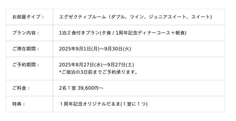 【1周年特別宿泊プラン 開催概要】