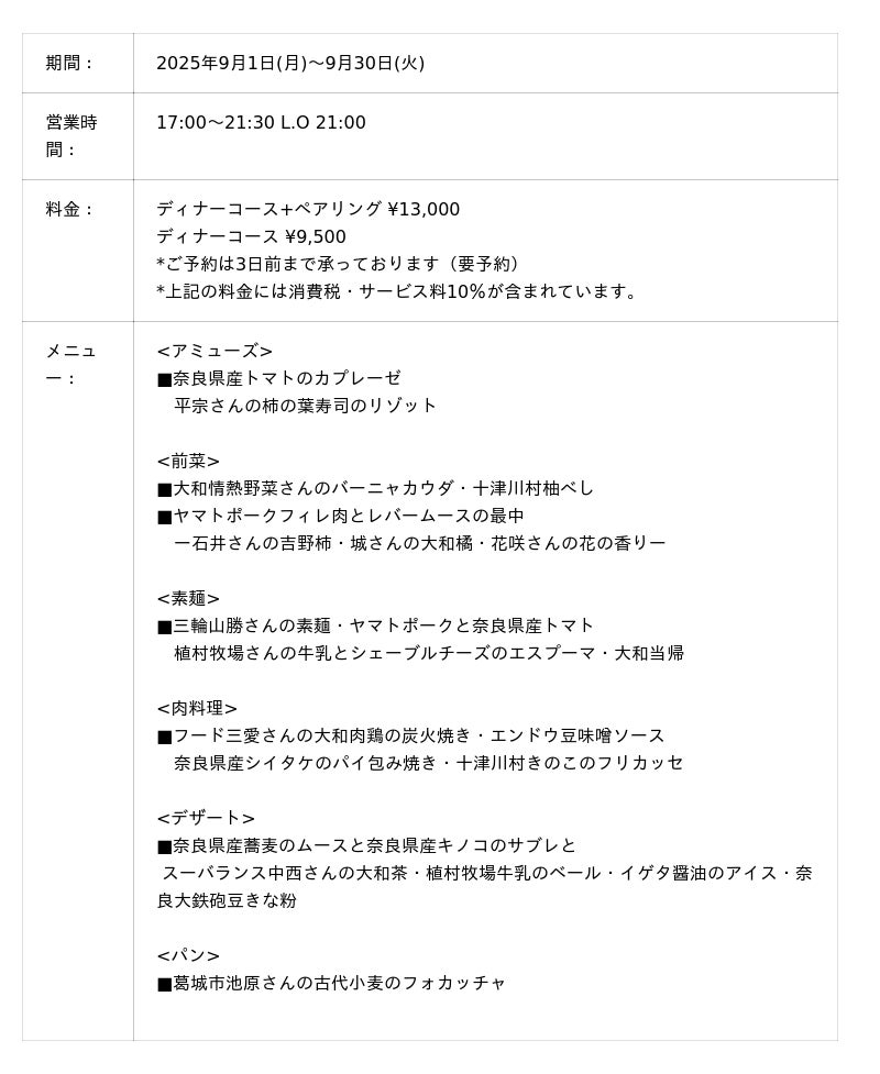 アミューズには、奈良県産トマトのカプレーゼや、平宗の柿の葉寿司を甘酸っぱくアレンジしたリゾットを。前菜には、大和野菜のバーニャカウダや、ヤマトポークとレバームースを最中に包み、吉野柿や大和橘を添えて華やかに仕上げています。三輪山勝の手延べ素麺は、植村牧場の牛乳や大和当帰で爽やかな香りを加え、メインでは大和肉鶏の炭火焼きや奈良県産シイタケのパイ包みで滋味豊かな味わいをご堪能いただけます。デザートには、大和茶、大鉄砲豆など、奈良の歴史や風土を感じる食材を使用。地域の生産者とともに作り上げた、ここでしか味わえない一皿一皿をお楽しみください。【1周年記念ディナーコース 開催概要】