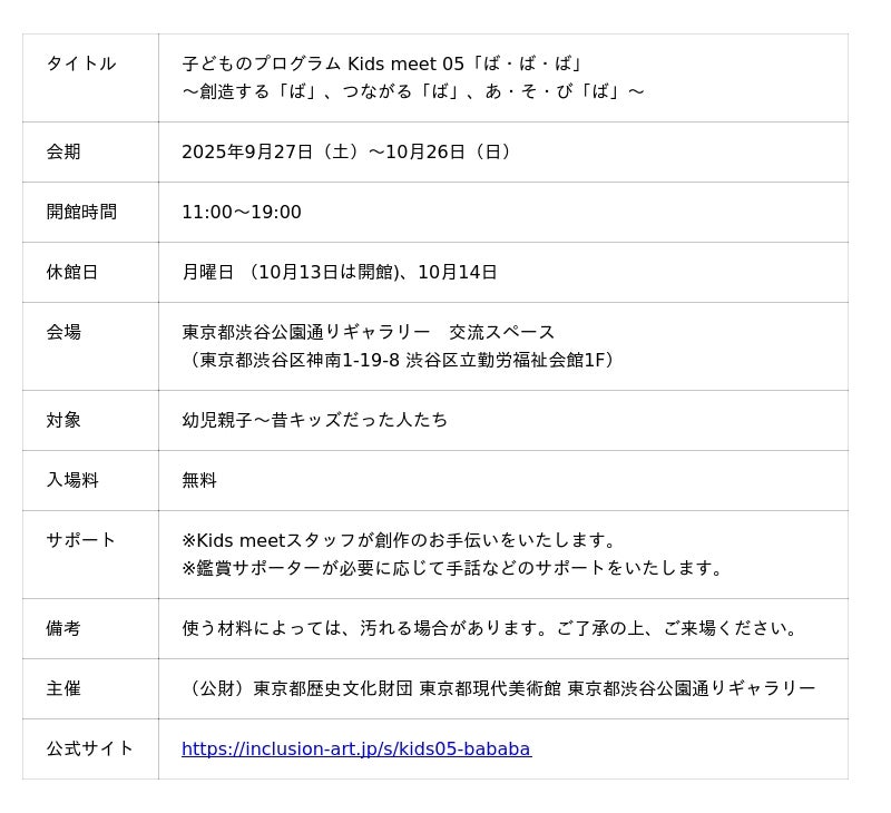 東京都渋谷公園通りギャラリーは2025年9月27日(土)~10月26日(日)の期間、子どものプログラム Kids meet 05「ば・ば・ば」を開催します。Kids meet 05ではアートスペース「ば・ば・ば」を立ち上げ、創作する「ば」、出会った人とつながりをつくる「ば」、そして子どもたち(大人たち)のあそび「ば」になることで、これら創造の場が人々の居場所になることを目指します。