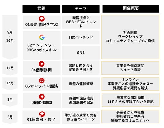 9月、10月、2026年2月に全受講者対面による講座を開催し、11月、2026年1月に個別相談、12月にオンラインによる個別面談を実施いたします。