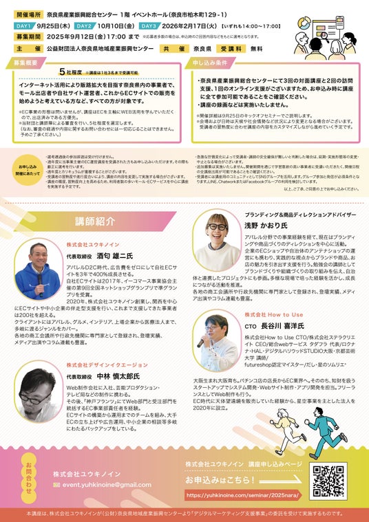 本講座は令和7年度「デジタルマーケティング支援事業」において受託事業者となった株式会社ユウキノインが実施するEC運営者向けのセミナーです。講座と個別支援で伴走。奈良県の事業者が無料で受講可能です。