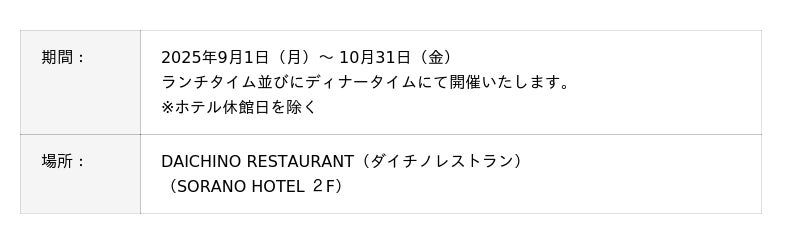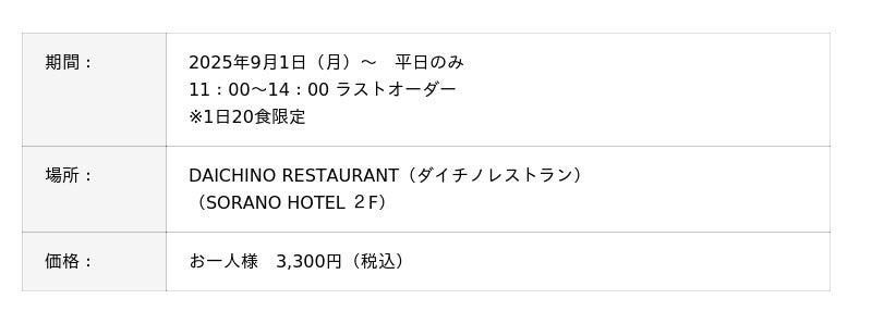 株式会社立飛ホスピタリティマネジメント(東京都立川市/代表取締役社長:村山正道)が運営するSORANO HOTEL(ソラノホテル)では、ロビー階にある DAICHINO RESTAURANT(ダイチノレストラン)にて2025年9月1日(月)より、平日限定ランチ『健酵美膳』(けんこうびぜん)のご提供を開始いたします。