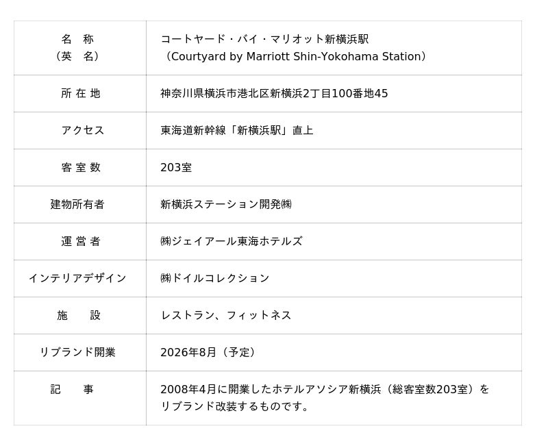 東海旅客鉄道株式会社(代表取締役社長 丹羽 俊介、以下「JR東海」)、新横浜ステーション開発株式会社(代表取締役社長 松尾 啓史)、株式会社ジェイアール東海ホテルズ(代表取締役社長 伊藤 彰彦、以下「ホテルズ」)、マリオット・インターナショナル(本社:米国メリーランド州 代表取締役兼CEO アンソニー・カプアーノ)は、ホテルアソシア新横浜を、「コートヤード・バイ・マリオット新横浜駅」(以下、「本ホテル」)として2026年8月にリブランド開業することをお知らせします。