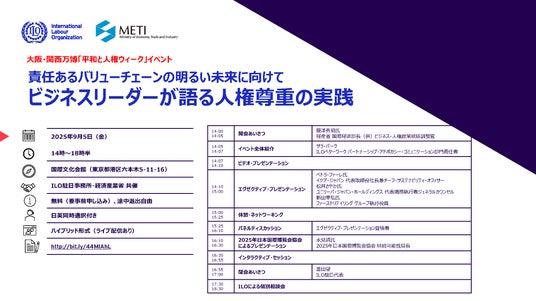 ILO駐日事務所と経済産業省は9月5日(金)午後2時から、東京・六本木の国際文化会館で「ビジネスと人権」についてのイベントを開催します。企業が人権や労働者の権利を守り、サプライチェーン全体でディーセント・ワーク(働きがいのある人間らしい仕事)をどう実現していくか話し合います。