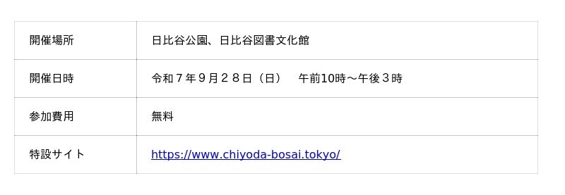 千代田区では、防災を自分ごととして捉え、相互に助け合い・支え合うことを考える機会として子ども・子育て世代をはじめとした多世代に向けた参加型の防災イベント「千代田区防災フェスタ」を9月28日(日)に日比谷公園、日比谷図書文化館で開催します。