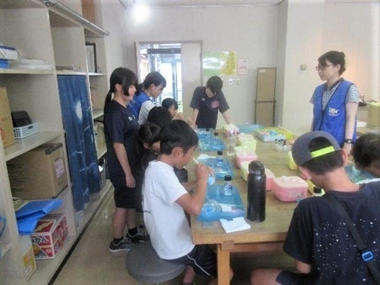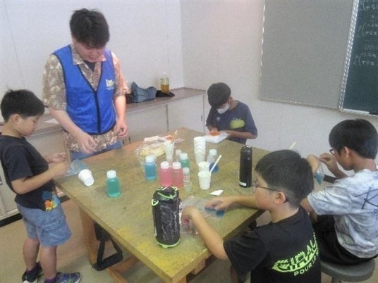 「ペットボトルでつくるキラキラ万華鏡」は人気のテーマで、終わりの会でも「楽しかったのは?」の問いに万華鏡を挙げる子どもたちが多く、それぞれがビーズやおはじき、クリップなどを選び、オリジナルの万華鏡作りを楽しみました。「入浴剤を作ろう」では、好きな形や色、香りを悩みながら選び、オリジナルの入浴剤を作りました。成形後に残った入浴剤の粉に水を少しずつ入れてシュワシュワと発泡する様子を「炭酸ジュースみたい!」と興味深く観察しました。「スライムで遊ぼう」は夏にピッタリの人気テーマで、好きな色で作成し手触りを楽しみました。