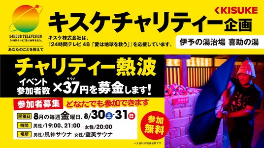 松山市、今治市で営業する喜助の湯では8月の毎週金曜日にサウナ室にて『熱波イベント』を開催し、参加者1名につき『サウナ』にちなんだ37円を24時間TVに寄付しました。