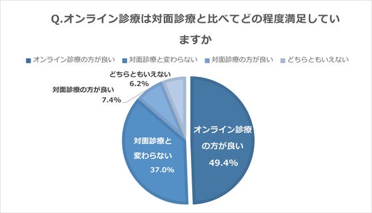 - 対面診療より良い/変わらない … 86.4%(「良い」49.4%、「変わらない」37%)