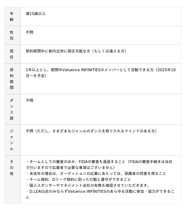 バリュエンスジャパン株式会社(本社:東京都港区、代表取締役:冨田 光俊)が運営するプロダンスチーム「Valuence INFINITIES(バリュエンス インフィニティーズ)」は、このたび、D.LEAGUE(Dリーグ)に所属するトップチームの新メンバーを募集するオーディションを開催いたします。