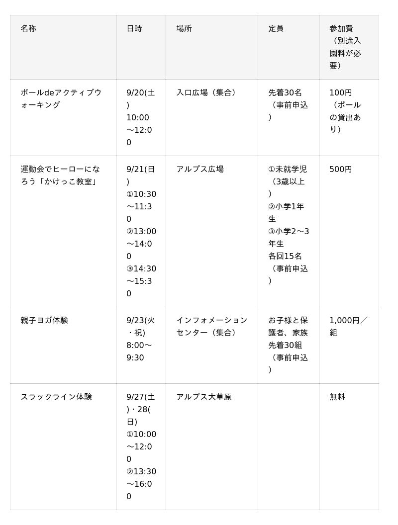 国営アルプスあづみの公園【大町・松川地区】では、9月13日(土)~10月13日(月・祝)の間、秋のイベント「秋の森チャレンジ」を開催します。公園のフィールドを活かして「アウトドア」「スポーツ」「そと遊び」をテーマに、多彩なコンテンツをご用意。秋の自然を満喫しながら、心身の健康促進とご家族・ご友人とのコミュニケーション活性化を図ることができます。