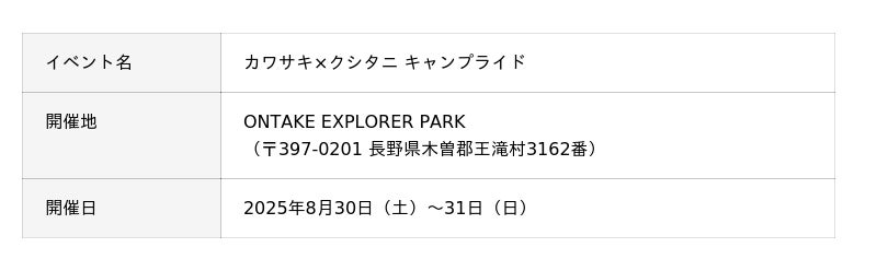 株式会社カワサキモータースジャパン(本社:兵庫県明石市、代表取締役社長:佐伯 健児)は、株式会社クシタニとのコラボレーションイベント「カワサキ×クシタニ キャンプライド」を2025年8月30日(土)~31日(日)にONTAKE EXPLORER PARK(〒397-0201 長野県木曽郡王滝村3162番)で開催いたしました。