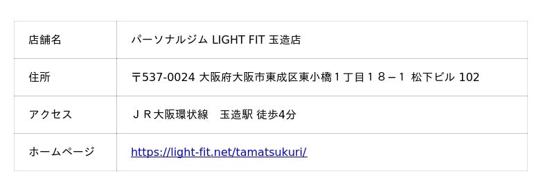 『理想のカラダを健康的に生涯持続する』を企業理念としている株式会社LIHGT FIT(本社:大阪市福島区、代表取締役:中田翔)は、玉造駅(所在地:〒537-0024 大阪府大阪市東成区東小橋1丁目18−1 松下ビル 102)にLIGHT FIT 玉造店をオープン。現在、大阪市9店舗を展開している。