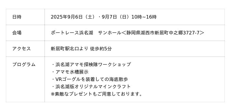 一般社団法人 静岡UP 浜名湖ワンダーレイク・プロジェクトは、2025年9月6日(土)と7日(日)にボートレース浜名湖にて開催される「見て知って感じて はまなこSHOW 2025」に出展します。今回の展示では、浜名湖の豊かな生態系を支える「アマモ」の役割や魅力を楽しく学べる企画をご用意しました。会場では、実際にアマモを観察できる「出張アマモ水槽」を展示するほか、浜名湖に起きている問題やアマモを増やす取り組みについて学べる内容となっています。また、VRゴーグルでの3D海底散歩も体験していただけます。さらに今回は、教育版マインクラフトを活用し、浜名湖を舞台にした特別ゲーム「メタもバース」を開発!世界初となるブルーカーボン・シミュレーションゲームを体験できます。ゲームの世界で遊びながら、楽しくアマモや水辺の環境について学べる内容です。いま浜名湖に起きている「アマモ急減」という現象や、浜名湖の生き物たち・生態系への影響、浜名湖を守っていくための活動などを知ってもらい、浜名湖に関する関心を高めてもらうことを目的とします。