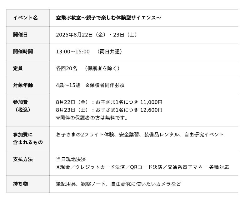 今回のイベントは、夏休みの自由研究の題材や親子一緒の思い出づくりとして大変ご好評をいただきました。FlyStation Japanでは、今回の取り組みを通じて得たノウハウを活かし、学校や学習塾でのサイエンス学習、幼稚園・保育園・学童などの課外活動や遠足プログラムとしてはもちろん、子ども会や地域イベント、科学館や公共施設との連携企画、さらには企業のファミリーデーや研修プログラムなど、幅広いシーンでの展開を予定しています。