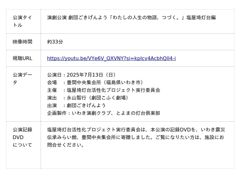 塩屋埼灯台活性化プロジェクト実行委員会(幹事社:いわき演劇クラブ)は、2025年9月5日(金)、今年7月に上演した演劇「劇団ごきげんよう『わたしの人生の物語、つづく。』塩屋埼灯台編」のダイジェスト&インタビュー映像を、YouTubeで公開しました。