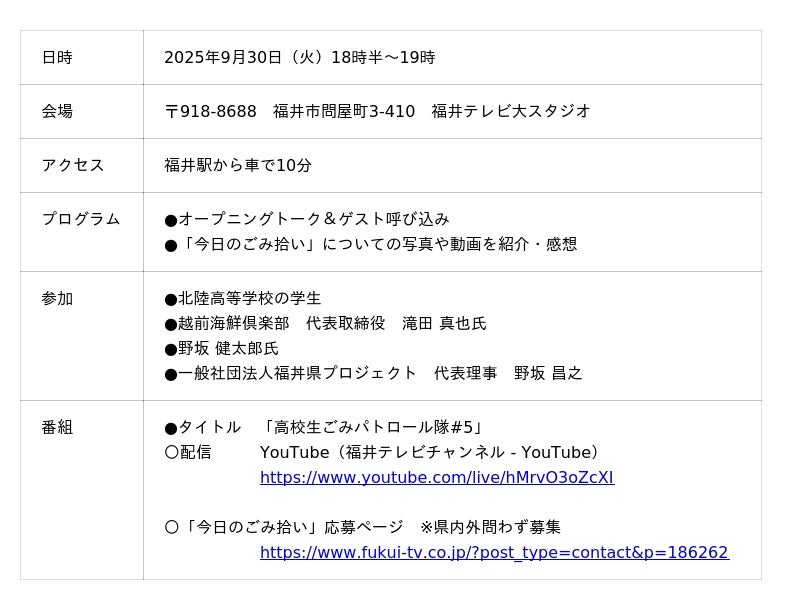 一般社団法人福丼県プロジェクトは、9月30日(火)に「高校生ごみパトロール隊」生配信の5回目を放送いたします。この生配信は、日本財団が推進する海洋ごみ対策プロジェクト「海と日本プロジェクト・CHANGE FOR THE BLUE」の一環で開催するものです。