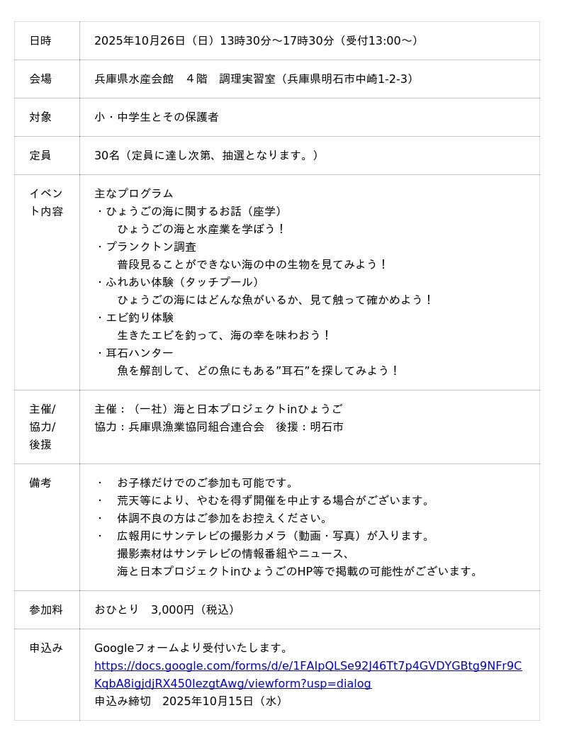 海と日本プロジェクトinひょうごは、2025年10月26日(日)に兵庫県内の小・中学生30名を対象としたイベント「習わないことを学ぼう!海が好きになるツアー」を開催いたします。