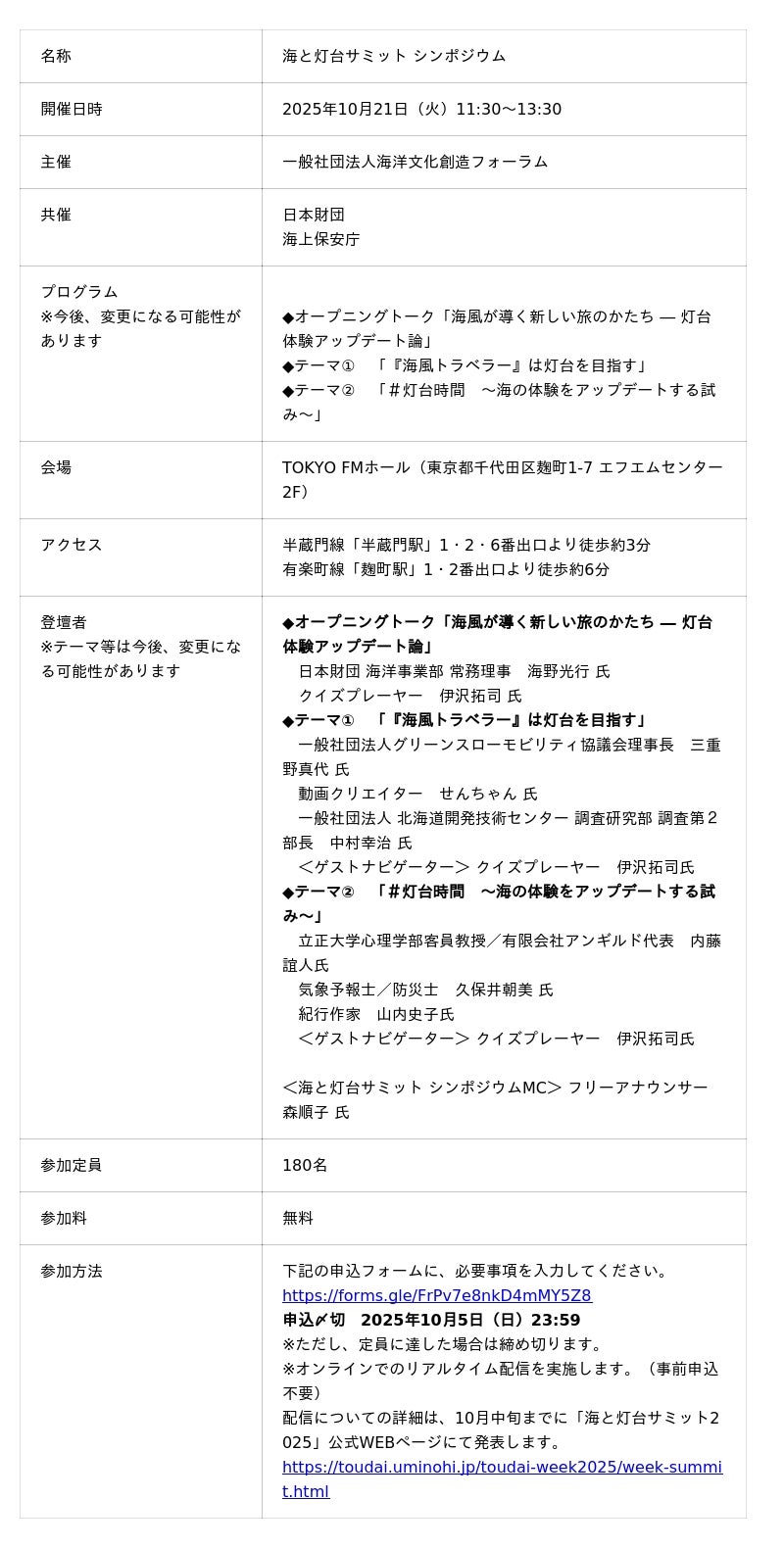 海と灯台サミット公式サイト:https://toudai.uminohi.jp/toudai-week2025/week-summit.html