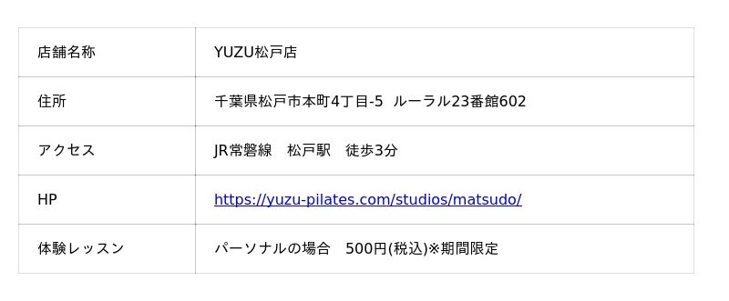 松戸駅に、ココロとカラダの健康美をサポートするピラティスレッスンを提供しているYUZUが通算53号店目を9月にOPEN!