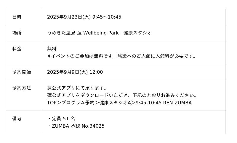 「うめきた温泉 蓮 Wellbeing Park」(総支配人:藤立 達哉、所在地:大阪市)は2025年9月23日に同施設での人気レッスンであるZUMBAの特別イベント「REN ZUMBA vol.4 ZAKKY×絵里奈」を開催することをお知らせします。
