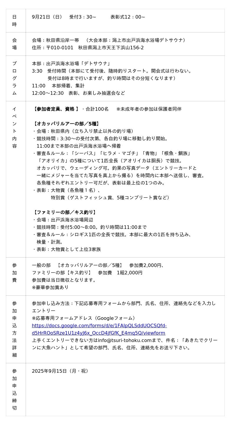 秋田県内(オカッパリ限定)を舞台に、オカッパリルアーの部(5種)、ファミリーの部(シロギス)の2部門で開催する「釣りキチ三平杯」。 いずれも1匹全長の大物賞を狙う1dayイベント!場所は潟上市出戸浜海水浴場「デトサウナ」が大会本部となり、午前3時30分から受付後釣りスタート。