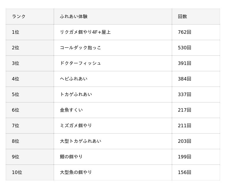アクアパーク川越の人気コンテンツ「ふれあい体験」の実施回数(2025年8月まで)を集計したランキングは以下の通りです。