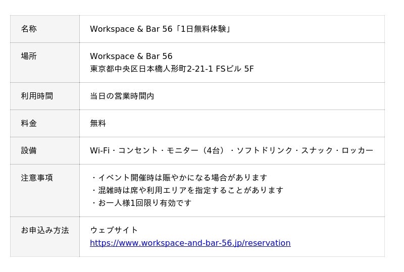 集中作業からWeb会議まで、多様な働き方に対応する「Workspace & Bar 56」の空間を、まずは無料でお試しください。