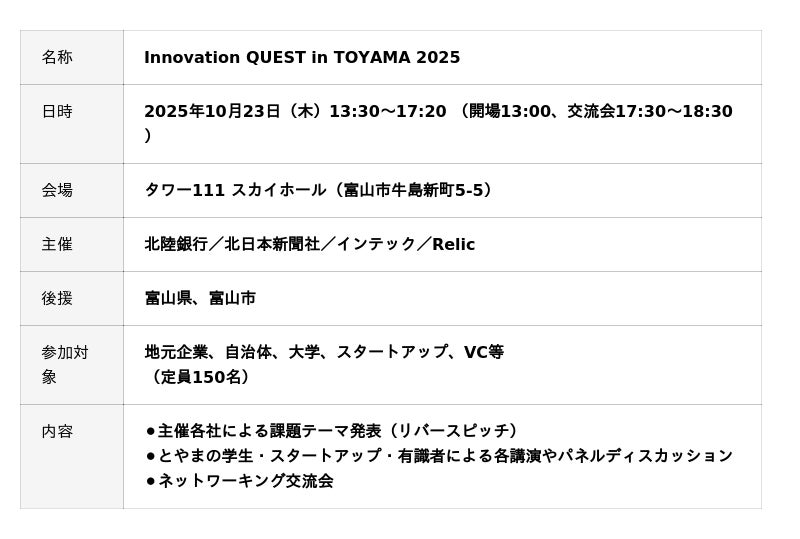 株式会社Relic(代表取締役CEO 北嶋 貴朗)、株式会社北陸銀行(頭取 中澤 宏)、株式会社北日本新聞社(代表取締役社長 蒲地 誠)、株式会社インテック(代表取締役社長 疋田 秀三)は 、富山県の地域イノベーションを推進する民間主導の「富山共創オープンイノベーションプログラム」を開始します。