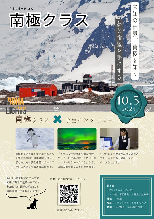 学生の「働く」を照らすキャリア教育プログラムいろはライト(本社:岡山市中区浜3-2-18ソレイユルバン浜102 高校生起業家:大西彩羽)は、イコットニコット2F ももスタで学生を対象とした体験型イベント「南極クラスinいろはライト10月イベント」を10月5日に開催します。岡山県の学生向けキャリア教育プログラム「いろはライト」は、将来の夢がまだ見つかっていない学生と、未来の仕事を繋げることを目的とした新しいキャリア教育プログラムです。南極クラスでは、南極の魅力や、仕事について、実際に南極から帰ってきたばかりのミサワホームの隊員さんの体験談をお伺いします。本イベントが、南極という未知の世界を知ることで、好奇心と探求心を刺激し学生が自ら未来を切り拓く力を育むことを目指します。