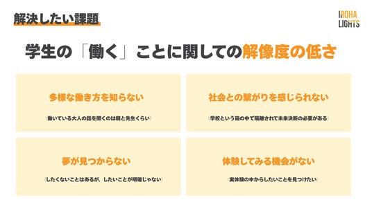 いろはライトで解決したい課題は、学生の「働く」ことに関しての解像度の低さです。